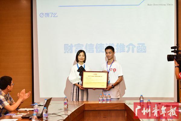 现场,财富青年志愿信使代表覃军志向饿了么公共关系总监张奕递送《2017广州