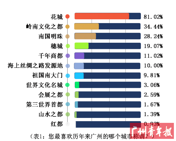 “世界文化名城、穗城、南国明珠、千年商都、会展之都……在广州历年来各种城市称谓中,哪个称谓最受公众欢迎?”9月14日,由广州市委宣传部与广东省社会科学院、广东省省情调查研究中心共同组成的课题组发布了《广州花城城市品牌战略规划研究报告》(以下简称“报告”),为广州进一步打造“花城”品牌构建蓝图:作为国家重要中心城市、海上丝绸之路始发地、粤港澳大湾区城市群核心城市,广州将在10年内建成一座“有生命、会生长”的世界级著名花城。同时,报告中的调查数据显示,在广州历年来的各种城市称谓中,“花城”称谓最受市民喜爱,81.02%的受访者表示认同(见表1)。