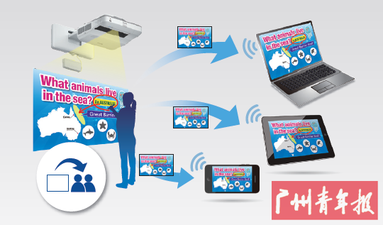 课堂教学越来越离不开投影设备的支持,老师们几乎每堂课都需要用投影机展示课件,或者把学生的作业用投影展示出来解析,从而加深学生对知识点的认知。然而这种教学方式需要老师提前将相关资料拷贝到电脑上,而爱普生教育超短焦互动投影机无线投影功能让课堂摆脱这样的“流程”束缚,轻松实现无线分享。