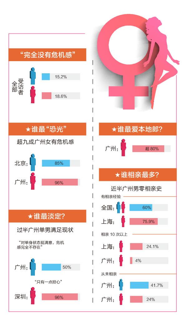 昨日是“光棍节”,又度过一“劫”的“光光”们安否?据国内一相亲网站光棍节前夕发布的调查报告显示,在北上广深四地,广州女北京男“恐光”感最强!96%的受访广州单身女性有危机感,而广州单身男性心态则超淡定,五成以上表示毫无危机感。