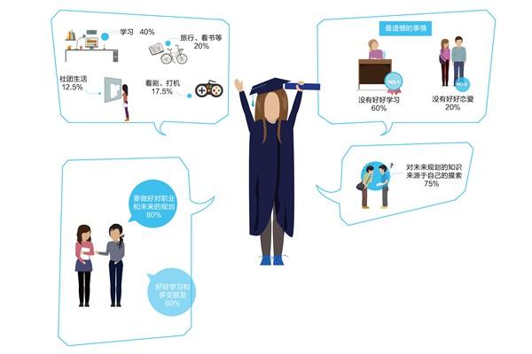 调查问卷显示,大学生活的遗憾来源是自己不知道该怎么做,无从下手规划学习生活、为未来做准备。除此之外,还有只当大学是用来玩、懒、不敢去追求以及不会很好地利用时间、没有自己的主见等心理原因。