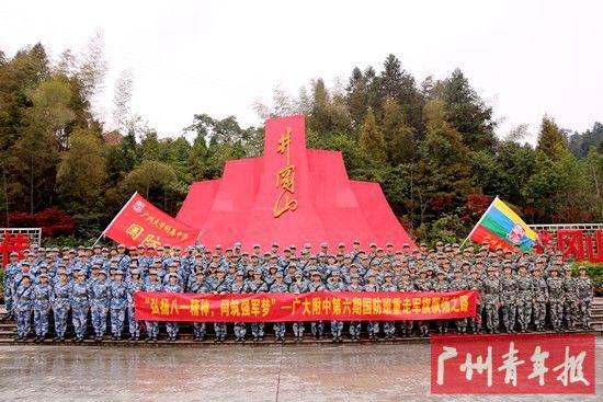 为纪念中国人民解放军建军90周年,11月10日~11月13日,广州大学附属中学(以下简称“广大附中”)第六期国防班出征“中国革命的摇篮”井冈山,开展“弘扬八一精神,同筑强军梦”活动,重走军旗飘扬之路。这4天来,广大附中国防班150名同学的足迹遍布井冈山革命遗址、北山烈士陵园、毛泽东旧居、井冈山革命博物馆等地,他们说自己仿佛乘坐了“时光机器”穿越了时空,真切感受到革命历程的艰辛,也体会到党的十九大报告中提出“坚持走中国特色强军之路”所承载的沉甸甸的使命感。