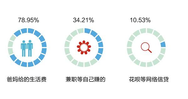 大学生买买买的消费主要来源于爸妈平时给的生活费,占到了75%。也有大部分是自己兼职赚钱。还有10%使用了花呗等时下在大学生中颇受欢迎的网络信贷。