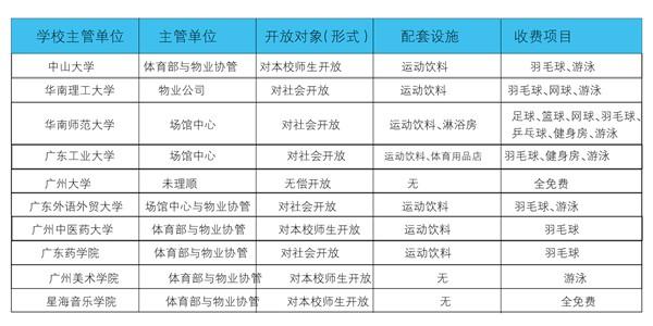 其他高校的体育健身情况不一而足,对本校师生和社会实行有偿开放,如华南理工大学、华南师范大学、广东工业大学、广东外语外贸大学、广东药学院;只对本校师生实行有偿开放,如中山大学、广州中医药大学、广州美术学院;无偿开放的仅有广州大学、星海音乐学院。