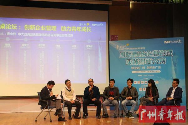 本报讯(记者 周司琪 通讯员 郑颖琼 傅虹)12日下午,由团市委等单位指导,市青创中心、中大咨询、广汽集团、广钢集团等单位联合主办的“青创杯”第五届广州青年创新创业大赛专项赛——国际青年企业管理实践创新大赛启动仪式暨“创新企业管理,助力青年成长”主题论坛及中国名企项目推介全国校园行•暨大站活动在暨南大学(石牌校区)管理学院101报告厅举行。来自主承办单位、各行业的青年创业导师、创投机构、知名企业及孵化园区负责人、创意创业团队以及青年大学生代表逾200人参加活动。