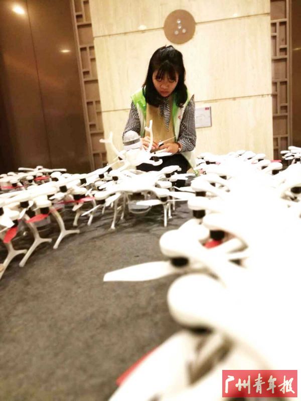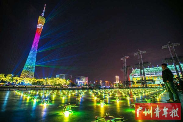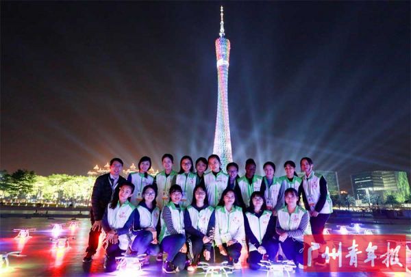 12月7日晚,2017广州《财富》全球论坛广州市欢迎酒会在广州塔下举行。当天晚上,1180架无人机编队瞬间亮灯形成“财富”两个汉字。广州用“科技舞蹈”表达了对2017广州《财富》全球论坛的欢迎。精彩的表演引起现场无数惊叹,但鲜少有人知道,在这场惊艳表演的背后,有一支志愿者队伍为它的顺利放飞默默努力,付出了辛勤的劳作。