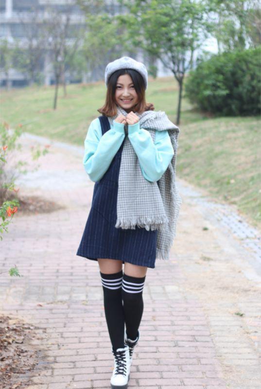 及膝袜:校园风里卖萌的必杀技,及膝袜一穿心梅萌妹纸的气质立刻飙高满分。南方菇凉普遍个子比较娇小,选择同色系或者花色呼应的及膝袜还可以调整身材的比例,“2米”大长腿不是梦,岛民如果想走可爱风可以尝试看看哦!