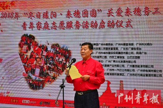 日期:[2018-01-04] 版次:[A02] 版名:[青播报]每逢春节,总有许多来穗务工青年因工作岗位原因无法回老家过年。为向一直以来关心、参与和支持广州城市建设的来穗务工青年表达感谢和祝福,今年,团市委、市委宣传部、市文明办、市来穗人员服务管理局等有关部门和单位再次发起“冬日暖阳·来穗团圆”关爱来穗务工青年家庭志愿服务活动,面向全国招募30户“团圆”家庭来花城看花、到广州过年。1月3日,2018年“冬日暖阳·来穗团圆”关爱来穗务工青年家庭志愿服务活动在农民工博物馆启动。主协办单位以及支持单位的领导嘉宾、来穗务工青年代表、往届“团圆”家庭青年代表、志愿者代表约200余人参加了当天的启动仪式。