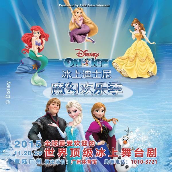 11月28、29日,2015冰上迪士尼之魔幻欢乐季的亚洲巡演正式开始,奥斯卡获奖动画片《冰雪奇缘》中两位冰雪公主首次降临亚洲,将“冰雪魔法”带到广州体育馆。此外,还有很多《美女与野兽》、《小美人鱼》、《魔法奇缘》等经典迪士尼动画片主人公在冰上翩翩起舞。