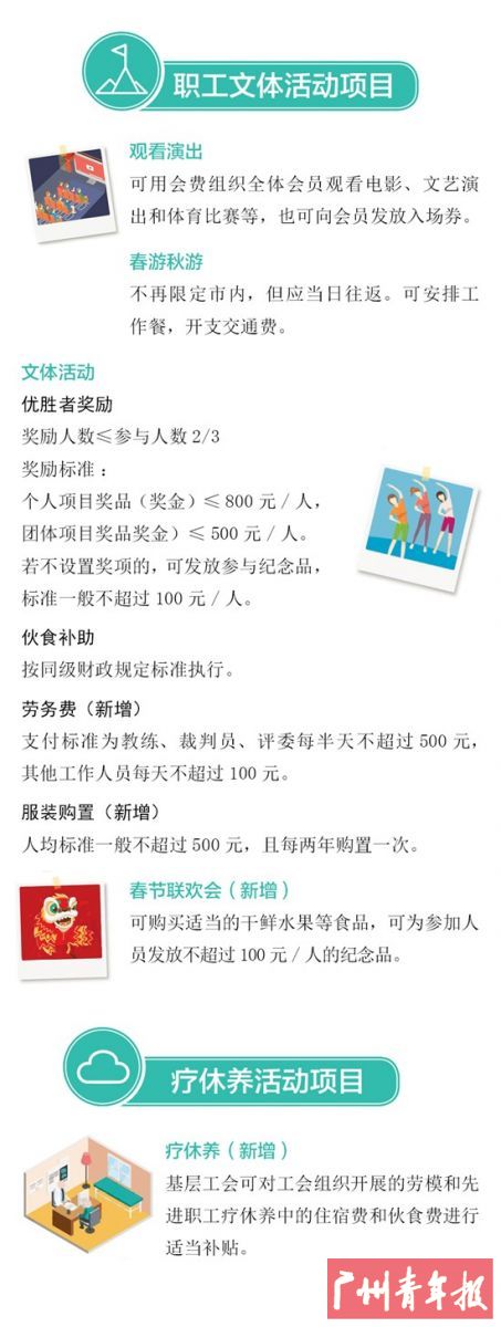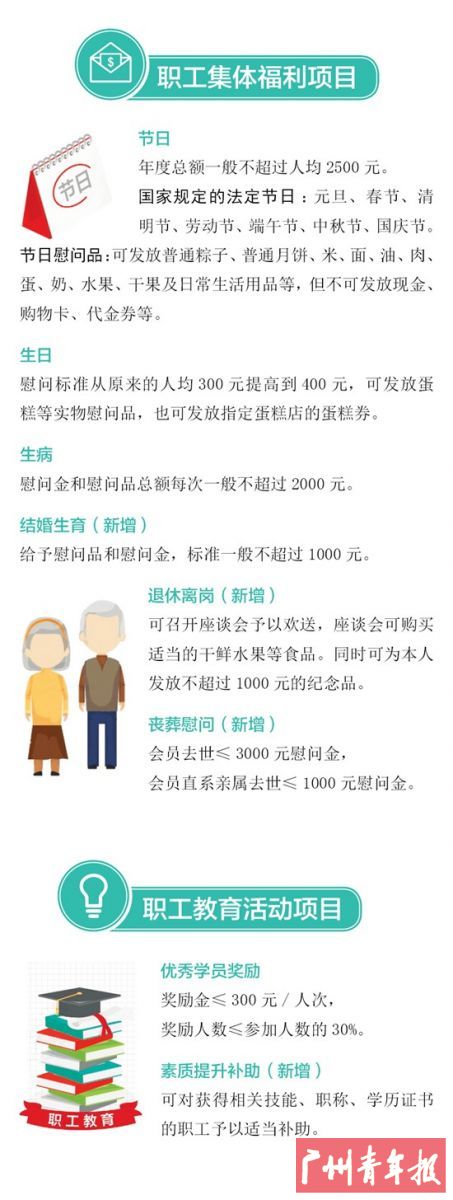 据记者了解,《广东省基层工会经费收支管理实施细则(试行)》共有23项支出项目,9项是原有项目,14项是新增项目。其中职工集体福利项目6项,职工教育活动项目2项,职工文体活动项目7项,职工疗休养活动1项,职工困难帮扶项目3项,工会业务建设项目4项。本期我们一起解读职工福利新标准。
