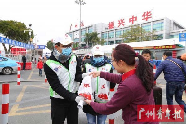虽然寒风凛冽,但无论是旅客入站口,还是广场上多个咨询点的志愿者们如常坚守在岗位上。广州火车站旁边的两家肯德基餐厅的小伙伴们,带着热腾腾的豆浆,分别来到公交站旁的服务点和越秀区团委志愿者休息的大本营。这里,有很多像小黄一样年轻的面孔。本周,广州火车站迎来旅客返乡的高峰。为了让100多名志愿者补充体力继续坚守,肯德基将连续一周每天两次送温暖,以实际行动为志愿者加油,将一份份温暖和关怀送给广州最可爱的人,感谢他们的坚持与付出。
