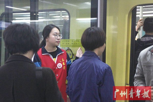 春节前一周,在下午5点到晚上7点的客流高峰时段,曾芷洋同学到杨箕地铁站参与地铁志愿者服务。她指着第19号门,告诉记者“春运时第19号门人流量最大,平时我们做的事情并不难,但客流情况比较复杂。”有一天,一位患有老年痴呆症的70多岁老奶奶与家人走散,芷洋第一时间跟她交流,发现对方对家的方向没有概念,便与站务员联系,值班站长通过老人免费卡查询到老人的入站站点,顺藤摸瓜找到了办卡时对方留下的联系电话,成功联系上她的家人。随后,芷洋与辅警一起搀扶着老人回到东山口,老人顺利回到家人身边。芷洋是城市轨道交通运营管理专业的学生,春节期间一边准备着高职考试参加辅导班,一边参加志愿服务。“两边跑虽然时常感觉劳累,但可以学到许多在学校学不到的东西。”