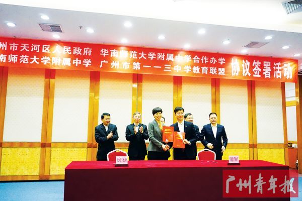 本报讯(记者 黄嘉欣)3月13日,广州市天河区人民政府与华南师范大学附属中学(以下简称“华师附中”)签订合作办学协议,双方合作复办华师附中初中部,全区公办小学学生有机会就读华师附中啦。另外,华师附中与广州市第一一三中学(以下简称“113中学”)建立教育联盟,113中学(高中部)将于今年9月招收2个“华附班”。