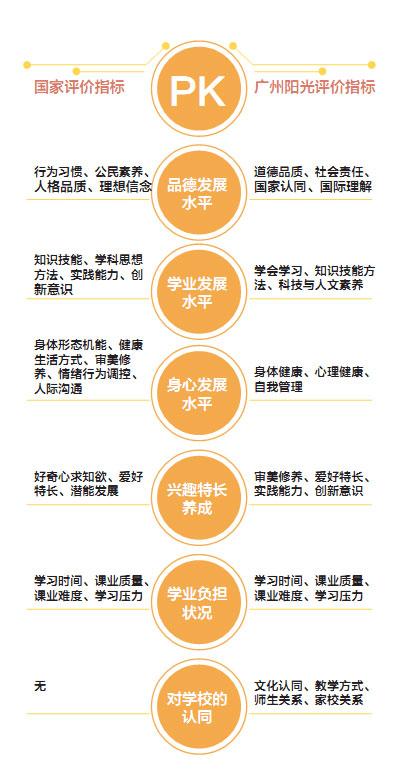 结合广州教育实际,广州市教育局于2014年5月公布了具有地方特色的教育质量评价指标——阳光评价体系。该评价体系涵盖小学、初中、高中三个学段,在国标的基础上进行扩展和细化,增加了“对学校认同”这一项,旨在反映广州市中小学近些年开展的以学校特色发展促进区域教育均衡发展、优质发展成果。从6个维度入手,确定了22个评价指标。