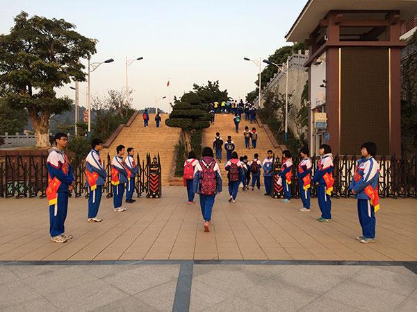 把主动权交还给学生,让学生在校园中有参与感和归属感,是学生形成自主管理的第一步。自2010年以来,科学城中学在校园内开展“志愿者值周班”活动,在校团委的全程参与和培养下,值周班已逐渐成为学校一大亮点和品牌。据德育主任邹水娣介绍,值周班活动面向学校高中部所有班级,每周一轮换,值周班级的职责包括每天早晨的礼仪问好、饭堂的秩序维护、协助图书管理员的常规管理,以及常规的班容班貌检查等内容。