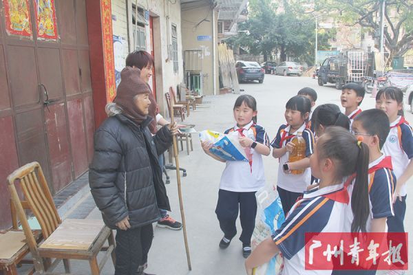 3月23日,黄埔区教育局在萝岗社区举办“学雷锋,敬老孝亲进社区”志愿活动,黄埔中小学学生在社区“搭台唱戏”,演绎“学感恩,与长者同乐”精彩文艺汇演,太极扇、流行舞、唱歌、朗诵……同学们各显才艺。舞台一侧,来自崇德实验学校、萝峰小学等5所学校进行爱心义卖活动,同学们手绘扇子、制作发饰、撰写书法作品、贩卖多肉植物。随后,长岭居小学同学还探访了社区独居长者、80多岁高龄的刘旺好老奶奶,送去生活必需品(见右图)。黄埔区教育局团委委员李瑮老师表示,“社区是我们有待开发的育人阵地,进社区活动可以提高学生的思想品质,同时帮助他们展示自我。”