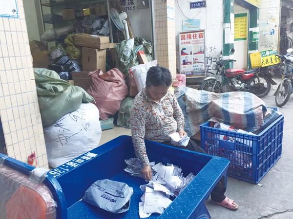由于今年的双十一狂欢节淘宝制定了一套新的派送规定即:“天猫商城双十一期间拍下的物品在十一月二十号前发货即可。”所以今年的双十一物流高峰来的比较晚,“现在(采访当日为,2015年11月22号)才是爆仓的时候,十五六号还不是怎么忙的呢。”张姐说,我们这个物流点只是负责北亭的,可是每天都有六七百个件,最高峰的时候是二十号左右,那时候一天单单北亭就有差不多一千个件。和很多外来人员一样,这个点也是夫妻店,张姐和老公加上婆婆,雇请了一两个老乡就这样简单的运作下来。所以每逢节日爆单的时候,每个人都要下场干活。婆婆坐在门口刚刚派了一轮单的三轮车里整理着一张张快递单;张姐服务着前来上门自提的人,丈夫刚刚送完回来又骑着充了电的电动车开始了新的一轮送件,另外两个老乡也是来来回回一遍遍的在北亭拿件、派件。“我们这个工作就是这样,一阵一阵的。夏天就是毕业季,那时候都是大件的行李。还有就是这个购物节,其实我自己一个都没有买,哪里有心情买呀,递包裹都要手抖了。”