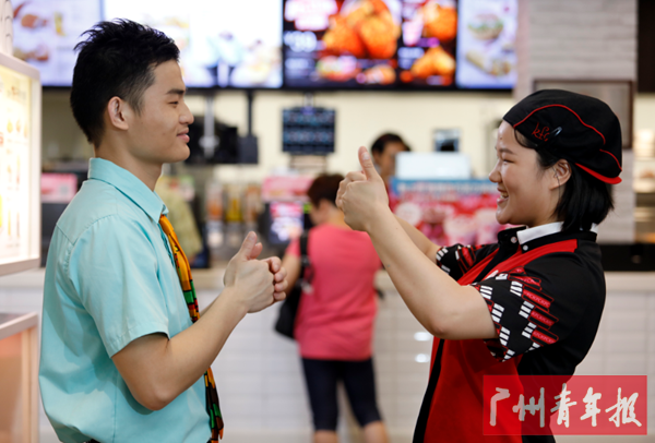 除了视频的体验,5月20日广州、佛山两地的一场“静音半小时”活动,更让市民亲身感受了无声的世界。据了解,这天适逢第二十八次全国助残日,广州市残疾人联合会、佛山市残疾人联合会、多家知名社工机构联合广东肯德基餐厅共同发起“静音半小时·无声有爱”公益行动:在广佛两家有半数以上全职员工为残障人士的天使餐厅,模拟了一个无声环境,让市民一起走近“天使”,体验无声交流,给他们爱的肯定和鼓励!