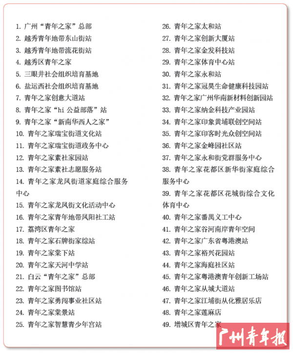 活动现场还发布了青少年服务阵地清单,清单包含了49家青年之家、青年地带等青少年服务阵地的名称、所属区域、地址、负责人等。“这批青年之家既有国家级和市级示范阵地,也有分布在各区、镇街以及工业园区等青年工作、生活聚集区域的阵地,都为了便于青年参与精品服务、就近参加活动。”