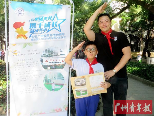 国旗班武警展示庄严的升旗仪式、温情的家书互赠环节、仪式感满满的新生入队、见证队员成长的火炬门、气氛high爆的亲子照片展......5月28日上午,“见证变化 携手成长 薪火传承”——见证广州改革开放40周年暨沙面小学2018年新生入队仪式在沙面岛的友好园进行,沙面小学三校区合计300名的一年级新生和400名家长共同见证这次别具意义的新生入队仪式。“我们学校联合市少工委、荔湾区教育局、广州青年报社等单位,以家校活动的方式倡导师生和家长感受祖国的强大,关注广州日新月异的变化,通过家校亲子活动唤起全社会对家风家训传承的重视,扩大家庭教育的影响力。”主办方相关负责人介绍说。