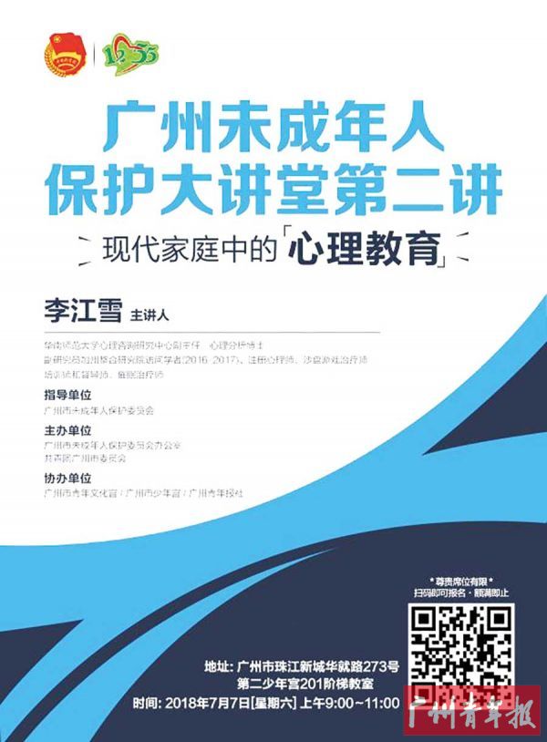 昨天(7月7日)上午,由广州市未成年人保护委员会指导,广州市未成年人保护委员会办公室、共青团广州市委员会主办,12355广州青少年服务台承办,广州市青年文化宫、广州市少年宫、广州青年报社协办的“广州未成年人保护大讲堂”第二讲在广州市第二少年宫开讲啦!本次讲座诚邀华南师范大学心理咨询研究中心李江雪主任与家长、孩子们面对面,就现代家庭教育中的心理教育进行交流。我们一起回顾当中的精彩内容吧。