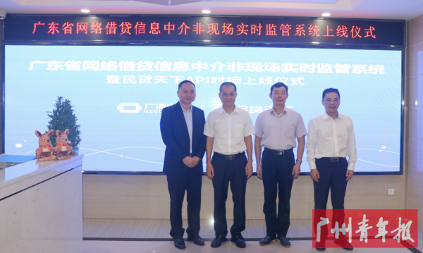 2018年7月12日上午,民贷天下与广东省地方金融风险监测防控中心(以下简称“防控中心”)举行了自动化系统对接上线仪式。标志着广东省网络借贷信息中介非现场实时监管系统(2.0版)正式上线,也意味着民贷天下成为全省第一家自动化接入防控中心非现场监管系统的机构,也是全国第一家自动化接入监管系统并实现实时数据对接的P2P平台。活动当天,广州市金融局何华权副局长、省金融办地方金融发展处刘方副调研员及防控中心负责人李杰、民贷天下执行总裁李海青等出席了上线仪式。