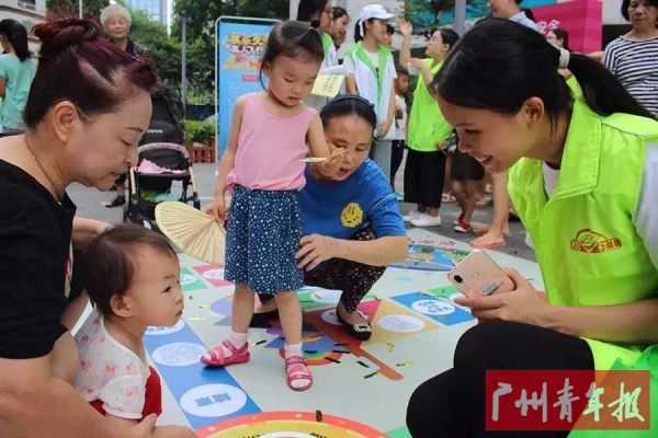 孩子和家长们在游戏中感受快乐、学习安全自护知识,同时也在展示摊位上了解、体验天河区青年地带的特色服务项目。