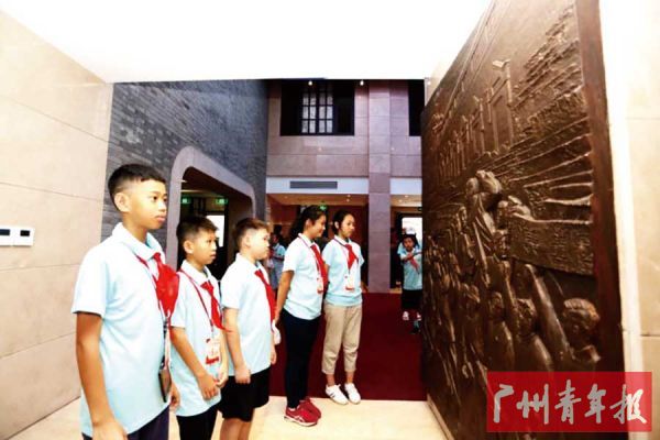 中国青少年宫协会红色基因主题教育工作委员会副主任、广州市青年文化宫五级职员吴启光向南京市青少年宫营员代表丁泽文授营旗后,同学们踏上红色旅程,前往中共二大会址纪念馆参观。