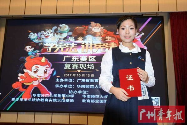 思远所在的中学——广州市天河外国语学校十分重视思想政治教育。去年11月,思远在朱云志、丁琪老师的教导下,参加了广东省教育厅举办的“学宪法讲宪法”演讲比赛,以实际行动践行社会主义核心价值观。比赛当天,她演讲的题目是《宪法阳光照耀心灵》:“习近平总书记指出:‘宪法的根基在于人民发自内心的拥护,宪法的伟力在于人民出自真诚的信仰。’”演讲中,思远这样理解和诠释宪法:“宪法像‘严父’般,约束着我们的一言一行,指引我们正确地学习、生活、工作……宪法又像‘慈母’一样,赋予我们作为公民的基本权利和义务,保护我们幸福地生活……”思远被庄严的宪法深深吸引,她说,宪法是国家的根本法,是党和人民意志的集中体现,每个公民都应该认真学习宪法,增强法治意识。在这次演讲比赛,思远获得了广东省的二等奖。