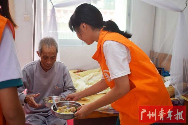早上9点,到达敬老院后,在团委书记助理曾庆潮老师的组织下,我校志愿者们分好了小组,3人一组,分别负责采访、记录和最后的发言。随后,志愿者们聚集于敬老院食堂,大家将月饼切成小块,把柚子剥开,准备送发给各位老人。