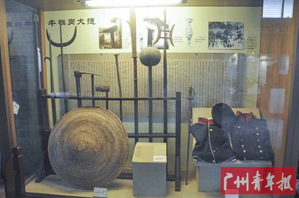 “牛栏岗大捷”文物史料 乡民们诱敌于牛栏岗,手提大刀、长矛、藤牌、三尖枪、挠钩、长棍、抬枪以及锄头等原始武器,追歼敌人。这是作战时所使用的原始武器,以及战胜后缴获的英军军服。
