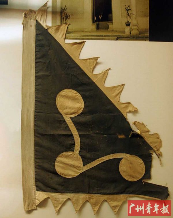 三星旗 这面黑底牙边三连星旗曾是三元里抗英斗争的指挥旗。为了反击进犯的英军,乡民们在韦绍光的带领下齐聚三元古庙誓师,取出庙里的三星旗作指挥旗,并约定“旗进人进,旗退人退,打死无怨”。