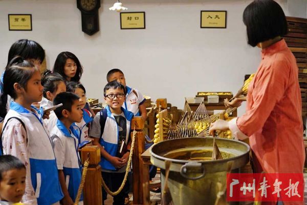 通过讲解员的介绍,小记者们了解到陈李济中药博物馆创建于2004年,是岭南首家中药行业博物馆。博物馆内陈列以场景复原为主要表现形式,将中药制作工艺过程展示出来,并通过陈李济药厂的历史和发展过程,展现中医药特别是“南药”深厚的文化底蕴。当中,最具特色的当属陈李济首创的蜡壳药丸包装工艺。广东地处岭南,自然气候潮湿,传统的中成药易发霉变,且一些香料的中药材因药性挥发而影响整体药效,并无法满足人们远足之需,蜡壳药丸制作工艺应运而生。陈李济中药博物馆经典重现了传统蜡壳药丸的八大工序:煮蜡、串原子、蘸蜡、鎅壳、入丸、封口、剪蒂、盖印。1981年,联合国世界科教文组织曾委托北京中医药学院和北京科教制片厂,选择陈李济的蜡壳丸生产工艺拍成纪录片,向全世界推广。