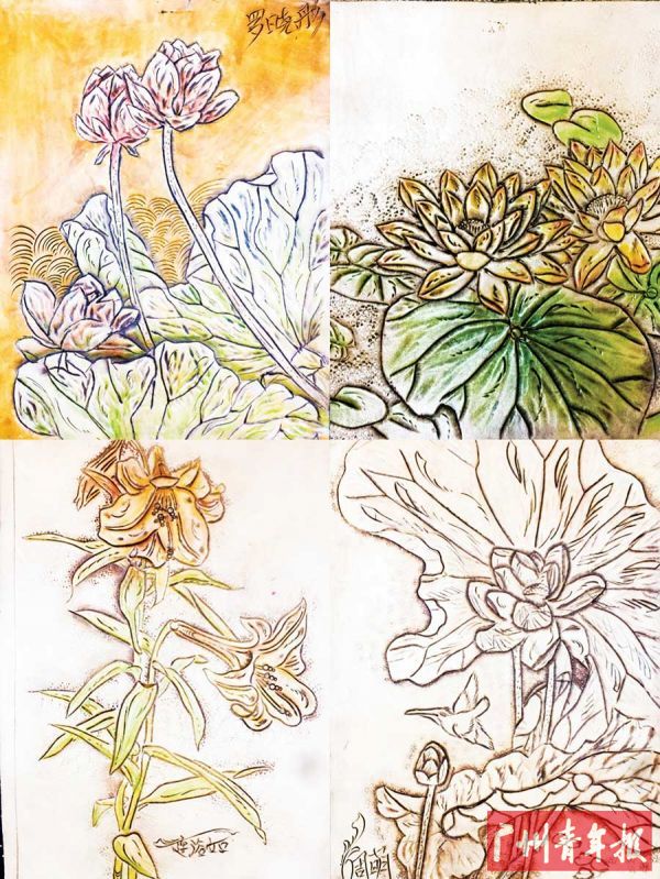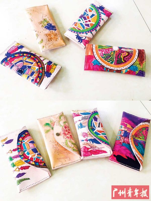 同学们争相参与皮雕特色课程学习,他们完成的皮雕作品在众多地方展览。