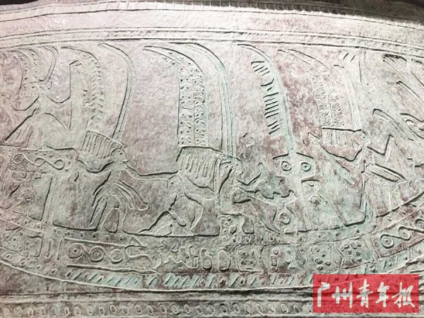 早在南越王时期,华夏民族就与别国有了文化交流影响。在“广东历史文化陈列”展馆,我看到从南越王墓挖掘出土的青铜器上刻有“羽人竞渡”的图案(如图)。肖副馆长说,他最近去意大利考察时,发现当地的一种羽人图案与此很相似。