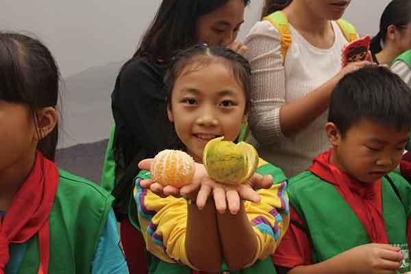 参观完博物馆,接下来就是亲手制作陈皮的环节了,校园记者们表现得跃跃欲试。在讲解员的指导下,大家先用鼻子分辨出不同年份的陈皮,从新鲜柑皮散发的芳香,到储存三年以上柑皮的陈香,不约而同得出了“陈皮,越陈越香”的特点。“时间越久的陈皮,个头越小,颜色越深,味道也越香浓,药用价值和经济价值也越高,这也正是百年陈皮名贵的原因。”然后,讲解员带领大家学习标准的“正三刀法”切出新会柑皮。“去柑取皮,就是制作陈皮的第一步。”在场的校园记者们不敢怠慢,马上紧跟着讲解员的步骤,首先在倒置的新会柑上割下一刀,然后在三分之一处再割一刀,最后在剩下的二分之一处割下第三刀,剥出连体的三瓣柑皮。“取皮后,将柑皮从里向外翻,晾晒储存三年以上,方称得上是陈皮。”记者们小心翼翼地运用着小刀,不少人都能完美地剥出了柑皮,兴奋地展示给一旁的父母看。