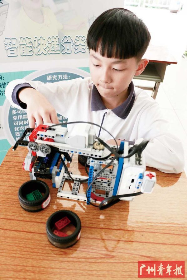 朝天小学五年(3)班郭潘鑫同学制作的“智能快递分类手臂”则出于节能、高效的考虑。“每逢购物节,快递订单就会增多,因此我设计了这个‘智能手臂’,它可以根据快递包裹的颜色实现自动分类,从而减轻快递分拣工人的劳动强度,提高分拣的速度和准确率。如果配合传送带,还可以实现快递物流中心的智能化自动分拣。”为了设计的作品更完美,郭潘鑫同学曾做过根据物品大小、高度的不同而实施的分拣测试。接下来,他计划尝试用扫码枪代替感应器,继续改进这个“智能手臂”。