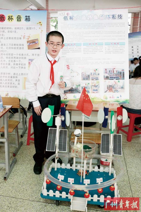 来到第34届越秀区青少年科技创新大赛现场,记者发现很多小发明不仅美观实用,还考虑到节能环保等问题,各种创意令人赞叹。来自建设大马路小学四年(3)班的陈星语同学设计“低碳生态养鱼循环系统”就兼备创新性、科学性和实用性:用架空透明的管道容器来养鱼,方便观赏;利用风-光互补储能装置发电,通过中央喷泉造景和增氧,低碳环保;安装紫外线灯吸引蚊虫自然喂养,省时省力。“我们尝试建立一个不依赖人工能源维持的低碳养鱼系统。”星语说。