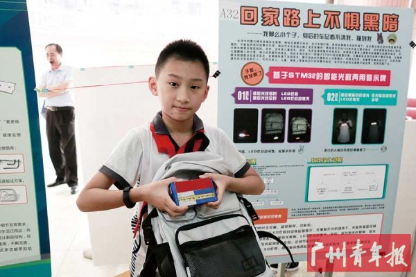 好创意源于对生活的观察和思考。农林下路小学四年(4)班吴桐同学发明的“智能光敏两用警示牌”就是因为曾目睹老人走夜路被撞,所以希望借助警示牌的反光和闪光功能,给路人提醒。同时,吴桐同学制作该作品的材料大都是回收再用的物品,比如外包装是废旧的环保袋,而里面堆砌的乐高积木块、LED灯,以及开关机头等都是从其他地方拆下来的,从而真正实现制作材料的环保、可循环利用。