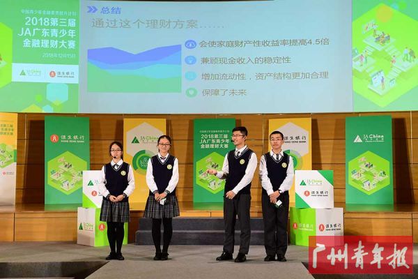 本报讯(记者 吴敏婷 通讯员 王佳营 王子晴)“假设你的银行存款账户利率是每年2%,通货膨胀率是每年3%。一年后,你这个账户的钱能买多少东西?”……12月15日,来自广州、佛山、深圳、珠海四个地区的12支高中学生队伍参加“恒生中国2018第三届广东青少年金融理财大赛”。“财智新一代”同台竞技,他们就个人所得税、创业风投与回报率、股票、基金、保险等金融知识技能进行切磋交流,展现优秀的品格智慧,体现了金融素养教育实践的成果。本次大赛由恒生银行(中国)有限公司(以下简称“恒生中国”)携手非营利教育机构青年成就中国(“JA中国”)共同举办。
