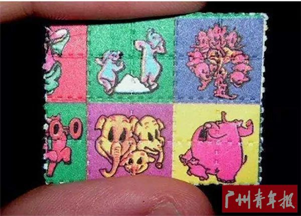 LSD全名麦角酰二乙胺(俗称“邮票”),是一种人工合成的致幻剂。LSD毒性极强,一般是摇头丸的3倍,只需很少剂量就能使人产生幻觉,引起心跳加速,血压升高,并出现急性精神分裂和强烈幻觉,甚至可能产生自虐和自杀倾向。将LSD粉末溶于水中,装在眼药水瓶里面,滴在指甲盖大小的纸片上,以颜色艳丽、图案可爱的形象进行伪装,非常吸引未成年人的眼球。将其含在舌苔上,吸收里面的致幻剂,30分钟便可起效,3至4小时达到高峰,毒效持续时间可达12小时。