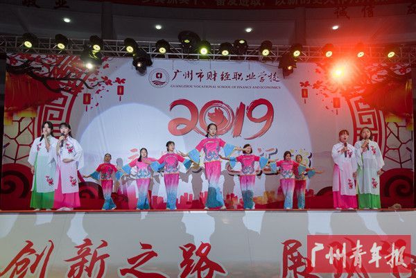 日期:[2019-01-06] 版次:[06] 版名:[德育风采]本报讯(记者 吴敏婷 实习记者 洪洁莹 摄影 张泳 通讯员 彭健祥)近日,广州市财经职业学校(以下简称“财经学校”)在华侨新村校区、太和校区举行“乘改革发展创新之路 展财经学子爱国之情”元旦文艺汇演。晚会活动中,舞蹈、合唱、小品、曲艺、武术、醒狮等各式节目应有尽有,各类表演精彩纷呈,展现了财经学校培育和践行社会主义核心价值观的教育成果,师生们通过校园社团文化展示抒发了家国情怀!