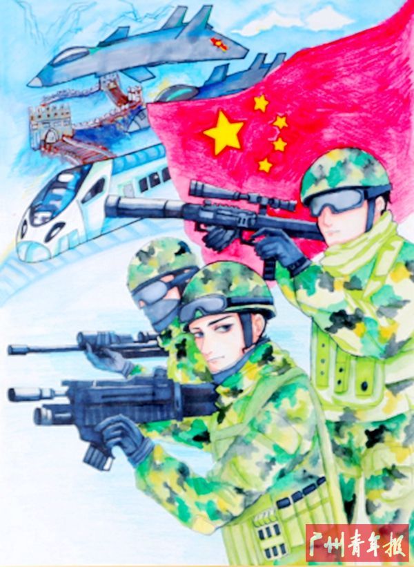 为了让大家一睹2018年“中国梦 延安情”中小学生书画比赛的获奖佳作风采,本次活动将广州、延安两地的部分优秀获奖作品在现场陈列展出。记者在现场看到,广州市执信中学吴玟亮同学的作品《新中国力量》荣获中学组绘画一等奖,其画面构图严谨,主体突出,色彩鲜艳明亮。“祖国的发展进入了新时代,军事力量、国防力量以及科技力量都已强大起来……”吴玟亮同学指着画中的五星红旗、高铁、长城等中国元素表达自己创作时的初衷。