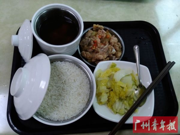 饭堂有一种饭营养均衡,有饭有菜又有肉,加五块钱还能够买一碗精心炖煮的排骨汤或是鸡汤。黄芯同学这餐吃的是“清蒸排骨饭”,今年大二的她很喜欢这个饭,“15元的价格吃出了在家里吃饭的温暖感觉”。