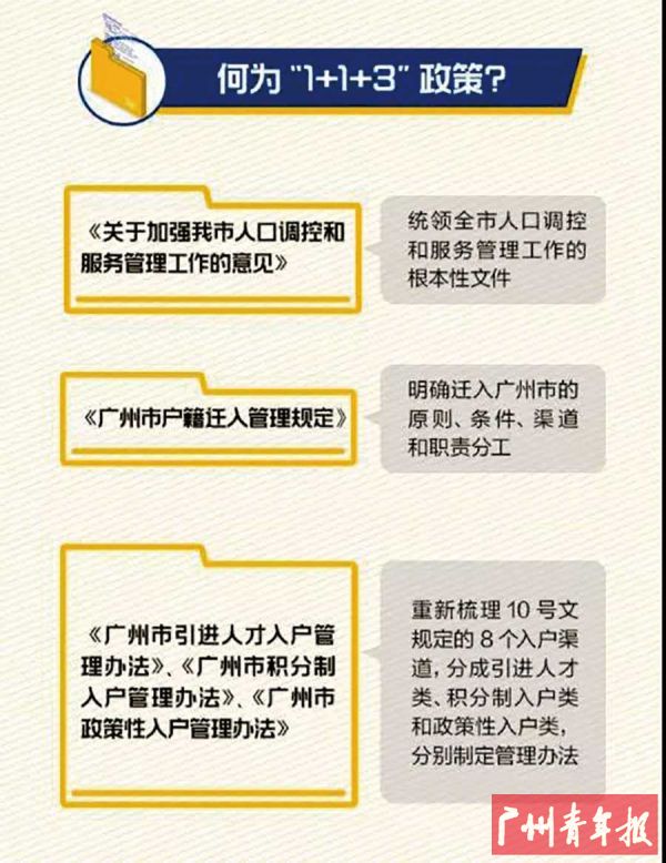 自2016年4月起,广州相关部门结合国家户籍制度改革有关要求、全市人口发展形势以及10号文实施情况,由市发展改革委牵头启动10号文修订,构建起“1+1+3”新一轮迁入户政策体系,并于近日正式印发实施。