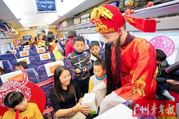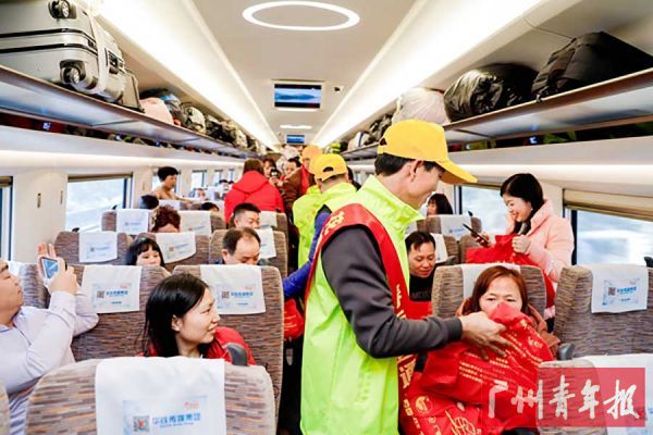 列车上随处可见的忙碌身影,就是可爱的随车志愿者。在广州至贵阳北动车发车前几天,一个名叫“爱随车•志愿在回家路上”的微信群悄悄组建起来,“我是8号车厢,吴老四”“我是5号车厢,谢忠俊”……几天后,随车志愿者们等到了首辆爱心专列的发车,他们为车内乘客送福气、派发福袋、时刻关注身边乘客需求,为乘客排忧解难。