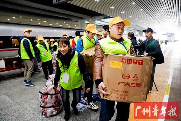 据了解,为了更好地为乘客提供优质、暖心的服务,主办方委托黄埔区青年社会组织联合会通过社会招募召集了一批春运志愿者,并开展岗前培训。首发当日,志愿者早早到达了广州火车站,搬运爱心专列物资、指引乘客进入候车室,每个人虽然累但都带着温暖的笑容。带队人刘克辉,人称“辉哥”,是一名铁路出身的工人,现在是黄埔区志愿者协会的志愿骨干。“我从20年前就开始接触志愿服务了,真正让我坚持下来的,是接受服务的人给到我的回馈。春运志愿服务我参加了5、6年,觉得很有意义,可以通过我们的努力让来穗务工人员感受到温暖,我作为广州人也很自豪。”刘克辉说。
