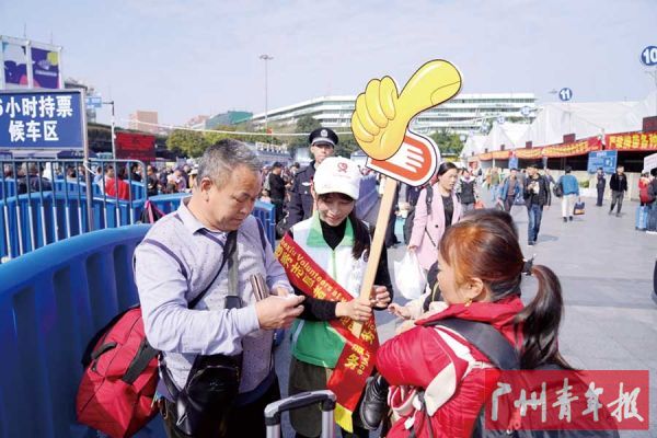 日期:[2019-02-14] 版次:[A03] 版名:[青播报]本报讯(记者 李扬 谭苏铭 摄影 黄宇帆)广州作为“反向春运”的热门城市,新春假期各大景点迎来不少游客,当游客有疑问或需要帮助的时候,志愿者伸出援手,展示了花城的热情,为城市形象增色。游客们对广州赞不绝口。春运期间的广州火车站及周围也多了很多志愿者的身影,他们尽心尽责地为旅客服务,广州火车站到处都有广州“赞”。与此同时,还有不少志愿者穿街过巷,去到老人院、独居老人家里送爱心,令老人家的春节不孤单。这个春节,在广州市的各个客运站场、花市、景区驿站、大街小巷都能见到志愿者的身影。无论大事小事,都有志愿者的参与,展现出广州“志愿之城”的风采。