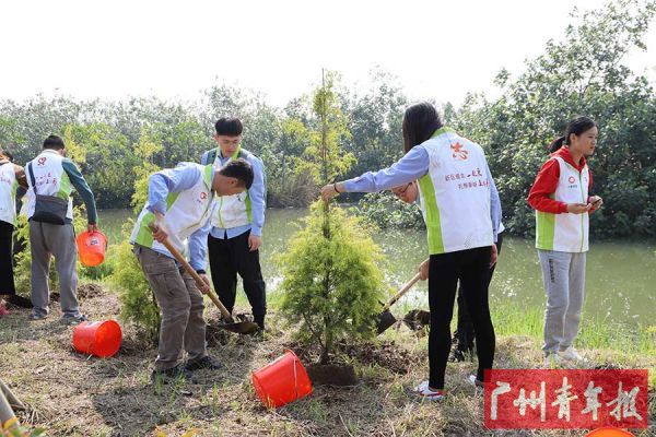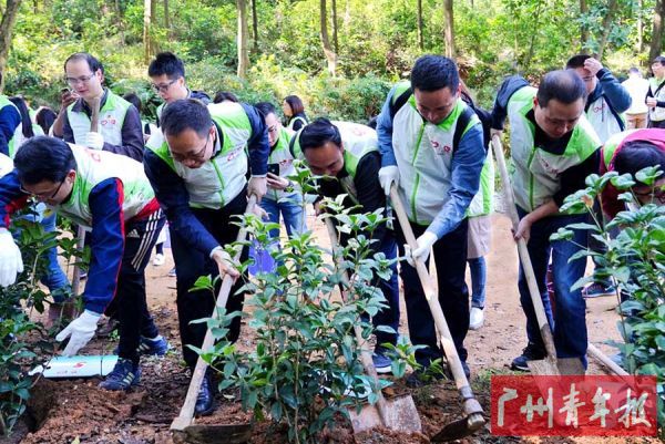 植树现场,每组4人共60人分工协作,在大金钟路门口植树、扶苗、培土以及浇水。据悉,3月12日当天,在白云山以外,全市各级团组织抓住春季适合植树造林的有利时节,利用植树节在河岸(湖畔)种植树木,为防止水土流失、提高水涵养能力做出应有贡献。团增城区委联合区林业和园林局上午9时在增城区第一中学开展植树节活动,植树80棵,并在周边开展卫生清洁志愿服务。团南沙区委组织志愿者200多人,开展“携手港澳添新绿 共植湾区青年林”2019年南沙新区青年植树护绿志愿服务活动,植树108棵,并进行了“最佳绿城传播者”线上投票活动,向更多的团员青年宣传植树造林和城市绿化的重大意义。团白云区委围绕3.12日植树节,组织党团员、大学生志愿者、少先队以及社工约200人到钟落潭镇良田村开展“青春心向党·建功新时代”——2019年白云区义务植树活动,种植了宫粉紫荆树苗100棵。