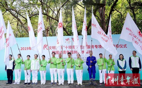 当天,十项青年志愿服务专项行动志愿者10名代表上台发布2019年新时代文明实践“十项青年志愿服务专项行动”。团市委书记徐柳、市水务局副局长彭大杰、团市委副书记孙柱、广州市精神文明建设委员会办公室副主任戴建生为2019年新时代文明实践“十项青年志愿服务专项行动”队伍授旗。